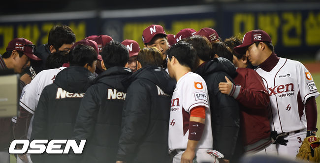11일 오후 서울 잠실야구장에서 열린 '2014 한국야쿠르트 세븐 프로야구 포스트시즌' 삼성 라이온즈와 넥센 히어로즈의 한국시리즈 6차전, 경기에 앞서 넥센 선수들이 덕아웃에서 하이파이브를 하고 있다.