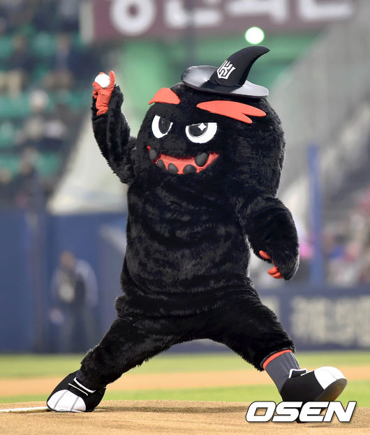 11일 오후 서울 잠실야구장에서 열린 '2014 한국야쿠르트 세븐 프로야구 포스트시즌' 삼성 라이온즈와 넥센 히어로즈의 한국시리즈 6차전, KT 마스코트 VIC가 시구를 하고 있다.