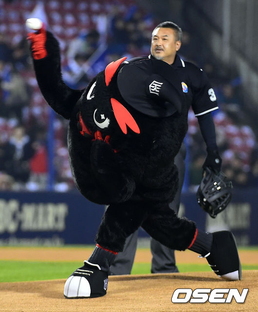 11일 오후 서울 잠실야구장에서 열린 '2014 한국야쿠르트 세븐 프로야구 포스트시즌' 삼성 라이온즈와 넥센 히어로즈의 한국시리즈 6차전, 경기에 앞서 KT 마스코트 빅이 시구를 하고 있다.
