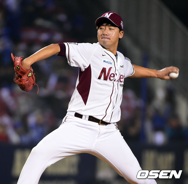 11일 오후 서울 잠실야구장에서 열린 '2014 한국야쿠르트 세븐 프로야구 포스트시즌' 삼성 라이온즈와 넥센 히어로즈의 한국시리즈 6차전, 1회초 넥센 선발투수 오재영이 역투하고 있다