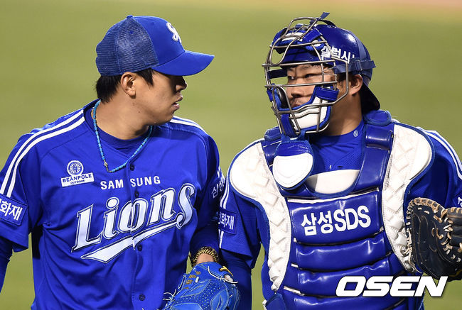 11일 오후 서울 잠실야구장에서 열린 '2014 한국야쿠르트 세븐 프로야구 포스트시즌' 삼성 라이온즈와 넥센 히어로즈의 한국시리즈 6차전, 1회말 2사에서 넥센 유한준을 외야플라이로 처리한 삼성 윤성환이 더그아웃으로 가며 포수 이지영과 이야기를 나누고 있다.