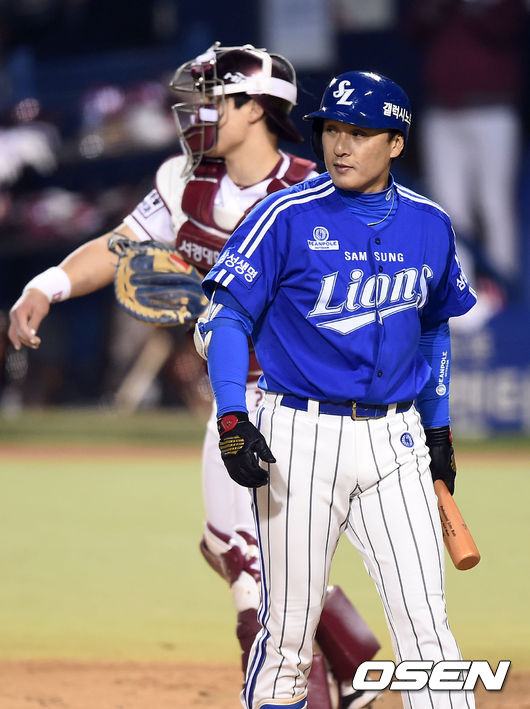 11일 오후 서울 잠실야구장에서 열린 '2014 한국야쿠르트 세븐 프로야구 포스트시즌' 삼성 라이온즈와 넥센 히어로즈의 한국시리즈 6차전, 2회초 1사 1루에서 삼성 이승엽이 삼진으로 물러나며 아쉬워하고 있다.