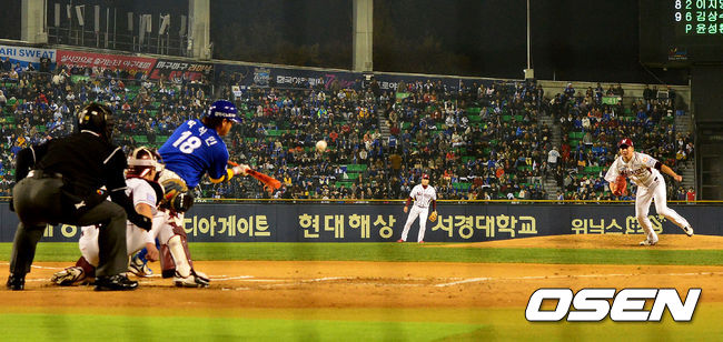 11일 오후 서울 잠실야구장에서 열린 '2014 한국야쿠르트 세븐 프로야구 포스트시즌' 삼성 라이온즈와 넥센 히어로즈의 한국시리즈 6차전, 2회초 무사 1루에서 삼성 박석민이 희생번트를 시도하고 있다. 희생번트 실패로 1루 주자 최형우는 포스아웃.