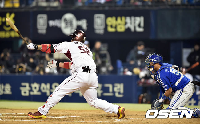 11일 오후 서울 잠실야구장에서 열린 '2014 한국야쿠르트 세븐 프로야구 포스트시즌' 삼성 라이온즈와 넥센 히어로즈의 한국시리즈 6차전, 2회말 박병호가 원바운드 볼에 헛스윙 삼진 당하고 있다.