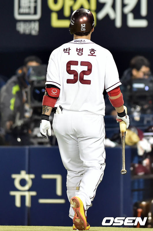 11일 오후 서울 잠실야구장에서 열린 '2014 한국야쿠르트 세븐 프로야구 포스트시즌' 삼성 라이온즈와 넥센 히어로즈의 한국시리즈 6차전, 2회말 선두타자로 나선 박병호가 삼진을 당하고 쓸쓸히 더그아웃으로 이동하고 있다.