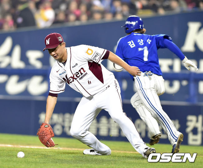 11일 오후 서울 잠실야구장에서 열린 '2014 한국야쿠르트 세븐 프로야구 포스트시즌' 삼성 라이온즈와 넥센 히어로즈의 한국시리즈 6차전,3회초 무사 1루 오재영이 김상수의 번트를 놓치고 있다.