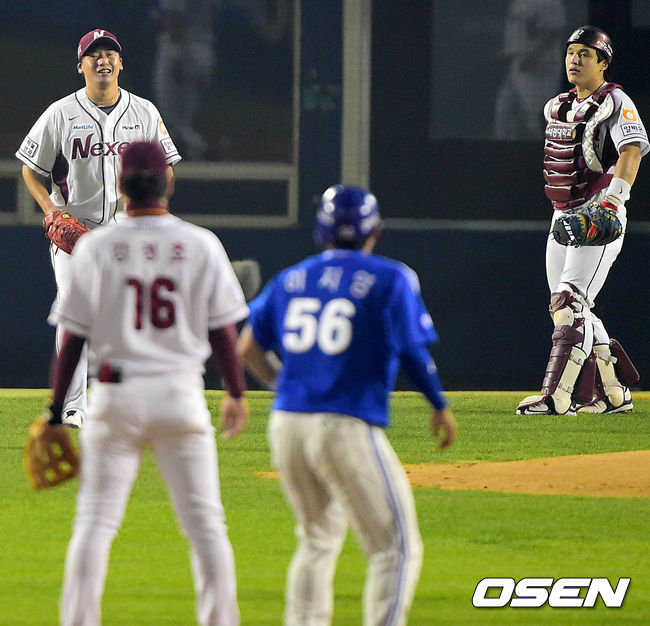 3회초 삼성 공격 무사 1루 상황 김상수의 번트타구를 더음으며 1루주자와 타자주자 모두 잡아내지 못한 넥센 선발 오재영이 아쉬워하고 있다.