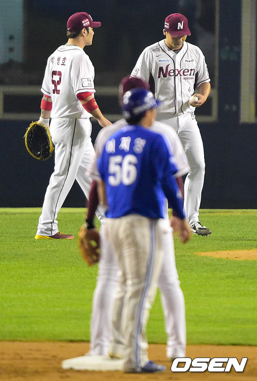 3회초 삼성 공격 무사 1루 상황 김상수의 번트타구를 더음으며 1루주자와 타자주자 모두 잡아내지 못한 넥센 선발 오재영이 아쉬워하고 있다.
