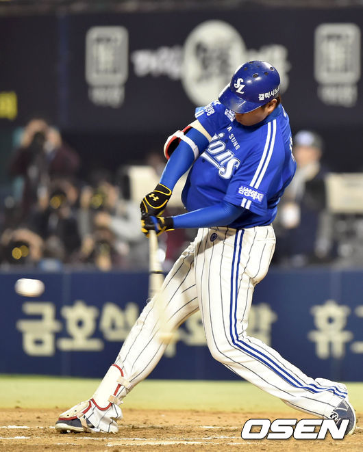 11일 오후 서울 잠실야구장에서 열린 '2014 한국야쿠르트 세븐 프로야구 포스트시즌' 삼성 라이온즈와 넥센 히어로즈의 한국시리즈 6차전,3회초 1사 만루 채태인이 2타점 적시타를 날리고 있다.