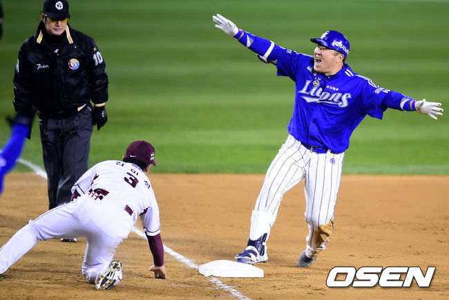 11일 오후 서울 잠실야구장에서 열린 '2014 한국야쿠르트 세븐 프로야구 포스트시즌' 삼성 라이온즈와 넥센 히어로즈의 한국시리즈 6차전, 3회초 1사 1,3루에서 삼성 최형우이 2타점 적시 2루타를 날리고 3루에서 세이프되며 포효하고 있다.