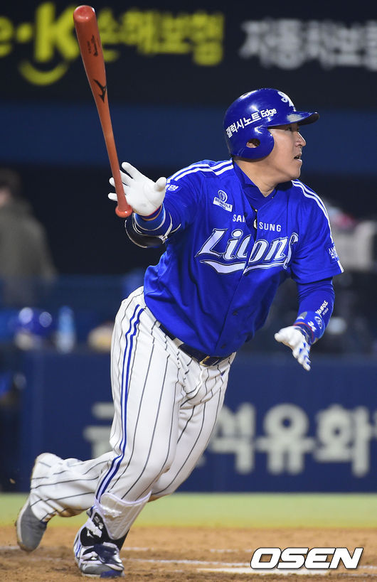 11일 오후 서울 잠실야구장에서 열린 '2014 한국야쿠르트 세븐 프로야구 포스트시즌' 삼성 라이온즈와 넥센 히어로즈의 한국시리즈 6차전,3회초 2사 1,3루 삼성 최형우가 2타점 3루타를 날리고 있다.