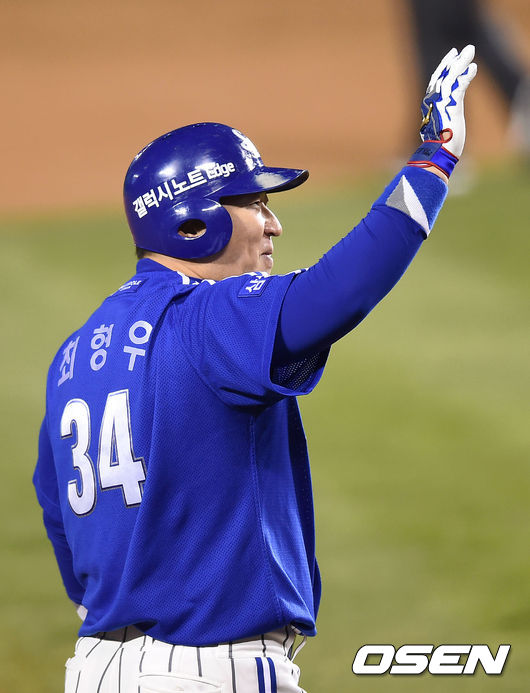 11일 오후 서울 잠실야구장에서 열린 '2014 한국야쿠르트 세븐 프로야구 포스트시즌' 삼성 라이온즈와 넥센 히어로즈의 한국시리즈 6차전, 3회초 1사 1,3루에서 삼성 최형우가 우중간을 가르는 2타점 적시 3루타를 치고 환호하고 있다.