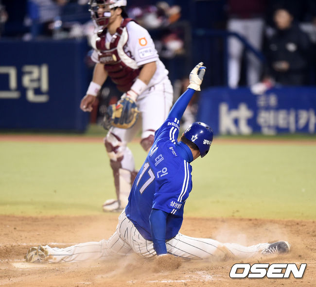11일 오후 서울 잠실야구장에서 열린 '2014 한국야쿠르트 세븐 프로야구 포스트시즌' 삼성 라이온즈와 넥센 히어로즈의 한국시리즈 6차전, 3회초 1사 1,3루에서 삼성 최형우의 우중간을 가르는 2타점 적시 3루타때 1루주자 채태인이 홈에서 세이프 되고 있다.