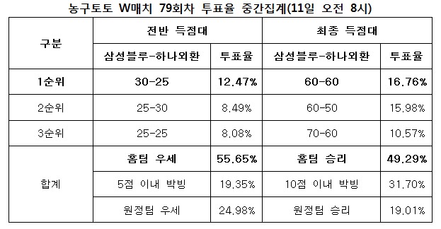 최종 삼성블루 60점대-하나외환 60점대 16.76%로 최다 집계…12일(수) 오후 6시 50분 마감