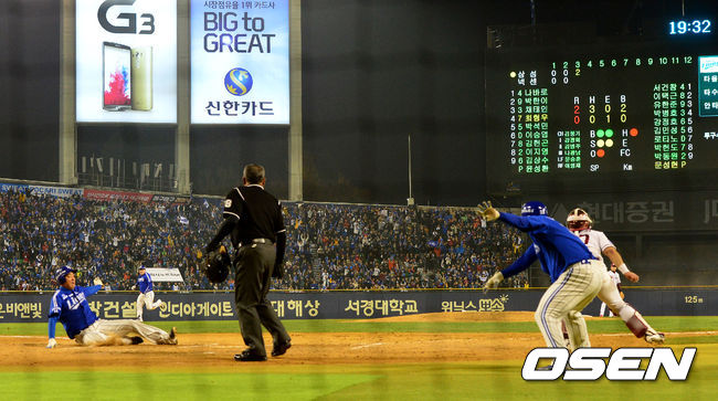 11일 오후 서울 잠실야구장에서 열린 '2014 한국야쿠르트 세븐 프로야구 포스트시즌' 삼성 라이온즈와 넥센 히어로즈의 한국시리즈 6차전, 3회초 1사 1,3루에서 삼성 최형우의 2타점 적시 2루타에 채태인이 홈에서 슬라이딩하며 세이프되고 있다.