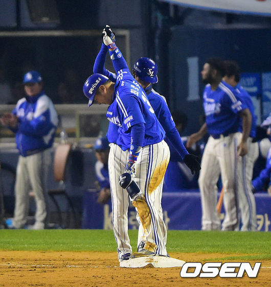 3회초 삼성 공격 1사 1, 3루 상황 최형우가 적시 2타점 좌중간 3루타를 날린 뒤 세이프된 뒤 김희걸 코치와 인사를 나누며 기뻐하고 있다.