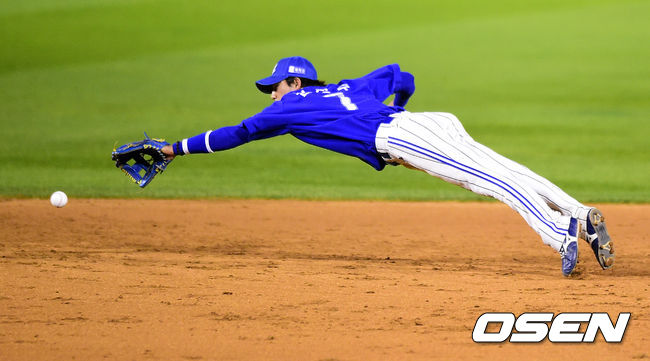 OSEN=잠실, 지형준 기자] 11일 오후 서울 잠실야구장에서 열린 '2014 한국야쿠르트 세븐 프로야구 포스트시즌' 삼성 라이온즈와 넥센 히어로즈의 한국시리즈 6차전, 4회말 무사 1루에서 넥센 이택근의 1타점 좌전 적시타에 삼성 김상수가 몸을 날렸지만 아쉽게 놓치고 있다.