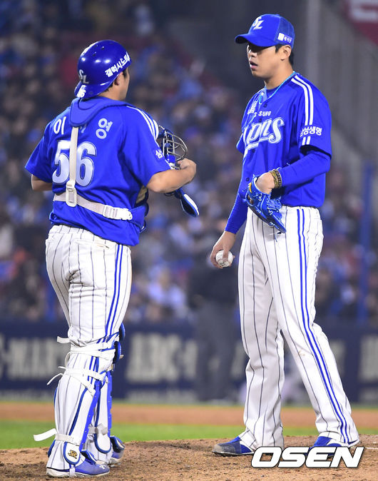 11일 오후 서울 잠실야구장에서 열린 '2014 한국야쿠르트 세븐 프로야구 포스트시즌' 삼성 라이온즈와 넥센 히어로즈의 한국시리즈 6차전,4회말 무사 1루 넥센 이택근에게 1타점 적시타를 허용한 삼성 선발투수 윤성환이 이지영 포수와 이야기르를 나누고 있다.