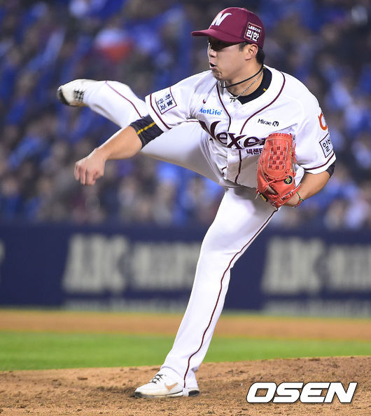 11일 오후 서울 잠실야구장에서 열린 '2014 한국야쿠르트 세븐 프로야구 포스트시즌' 삼성 라이온즈와 넥센 히어로즈의 한국시리즈 6차전,5회초 넥센 문성현이 역투하고 있다