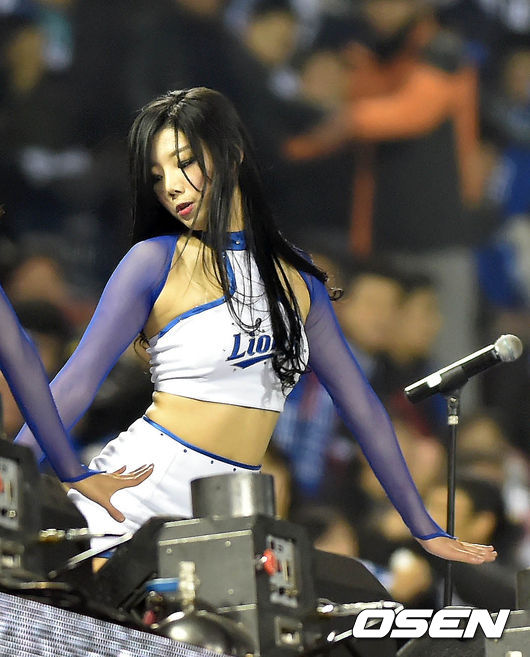 11일 오후 서울 잠실야구장에서 열린 '2014 한국야쿠르트 세븐 프로야구 포스트시즌' 삼성 라이온즈와 넥센 히어로즈의 한국시리즈 6차전,삼성 치어리더가 섹시한 댄스를 선보이고 있다.