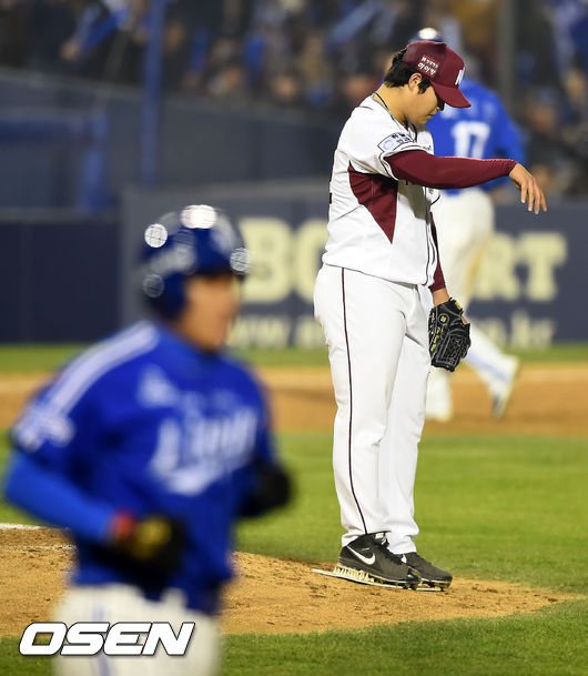 11일 오후 서울 잠실야구장에서 열린 '2014 한국야쿠르트 세븐 프로야구 포스트시즌' 삼성 라이온즈와 넥센 히어로즈의 한국시리즈 6차전, 5회초 2사 주자 1,2루 삼성 이승엽에게 볼넷을 내준 넥센 조상우가 아쉬워하고 있다.