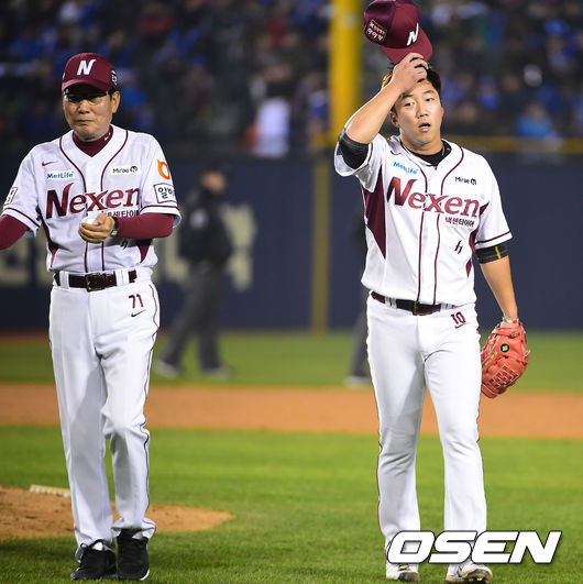 11일 오후 서울 잠실야구장에서 열린 '2014 한국야쿠르트 세븐 프로야구 포스트시즌' 삼성 라이온즈와 넥센 히어로즈의 한국시리즈 6차전,5회초 넥센 문성현 투수가 교체되고 있다.