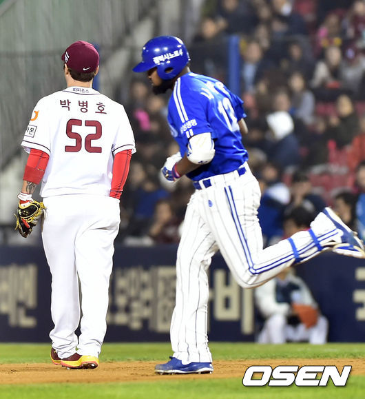11일 오후 서울 잠실야구장에서 열린 '2014 한국야쿠르트 세븐 프로야구 포스트시즌' 삼성 라이온즈와 넥센 히어로즈의 한국시리즈 6차전,6회초 무사 1,2루 나바로가 스리런 홈런을 치고 베이스를 돌고 있다.