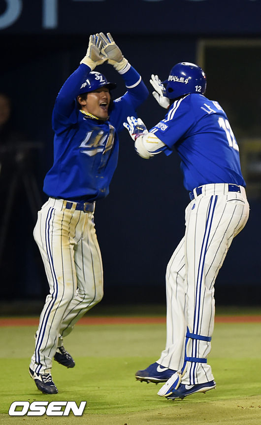 11일 오후 서울 잠실야구장에서 열린 '2014 한국야쿠르트 세븐 프로야구 포스트시즌' 삼성 라이온즈와 넥센 히어로즈의 한국시리즈 6차전, 6회초 무사 주자 1,2루 삼성 나바로가 좌중월 스리런 홈런을 날린 후 홈에서 김상수와 기쁨을 나누고 있다.
