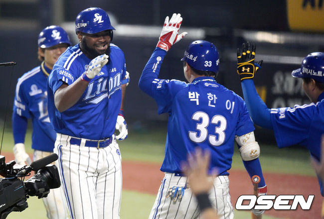 11일 오후 서울 잠실야구장에서 열린 '2014 한국야쿠르트 세븐 프로야구 포스트시즌' 삼성 라이온즈와 넥센 히어로즈의 한국시리즈 6차전, 6회초 무사 1,2루 넥센 조상우를 상대로 스리런을 날린 삼성 나바로가 덕아웃에서 동료들과 기뻐하고 있다.