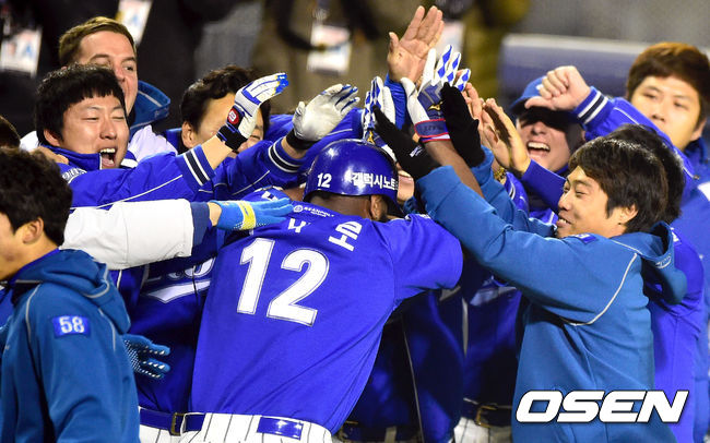11일 오후 서울 잠실야구장에서 열린 '2014 한국야쿠르트 세븐 프로야구 포스트시즌' 삼성 라이온즈와 넥센 히어로즈의 한국시리즈 6차전 6회초 무사 1,2루 삼성 나바로가 넥센 조상우를 상대로 스리런 홈런을 때린 뒤 동료들과 기뻐하고 있다.