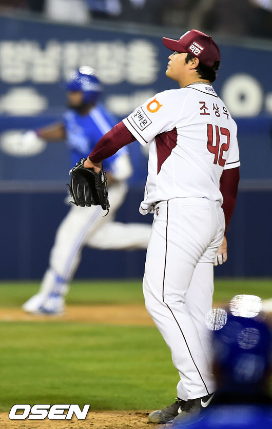 11일 오후 서울 잠실야구장에서 열린 '2014 한국야쿠르트 세븐 프로야구 포스트시즌' 삼성 라이온즈와 넥센 히어로즈의 한국시리즈 6차전, 6회초 무사 주자 1,2루 삼성 나바로에게 좌중월 스리런 홈런을 허용한 넥센 조상우가 나바로가 그라운드를 돌때 아쉬워하고 있다.