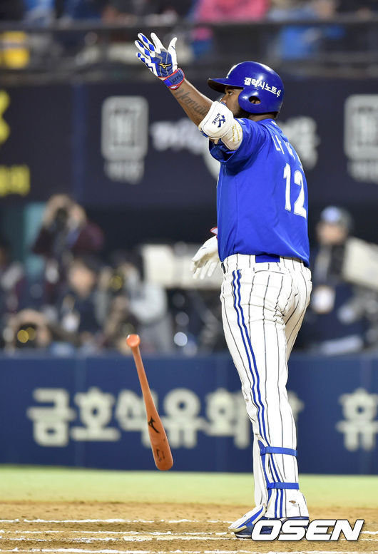 11일 오후 서울 잠실야구장에서 열린 '2014 한국야쿠르트 세븐 프로야구 포스트시즌' 삼성 라이온즈와 넥센 히어로즈의 한국시리즈 6차전,6회초 무사 1,2루 나바로가 스리런 홈런을 치고 환호하고 있다.
