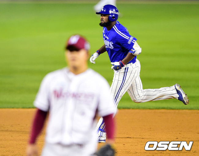 11일 오후 서울 잠실야구장에서 열린 '2014 한국야쿠르트 세븐 프로야구 포스트시즌' 삼성 라이온즈와 넥센 히어로즈의 한국시리즈 6차전 6회초 무사 1,2루 삼성 나바로가 넥센 조상우를 상대로 스리런 홈런을 때린 뒤 베이스를 돌고 있다.