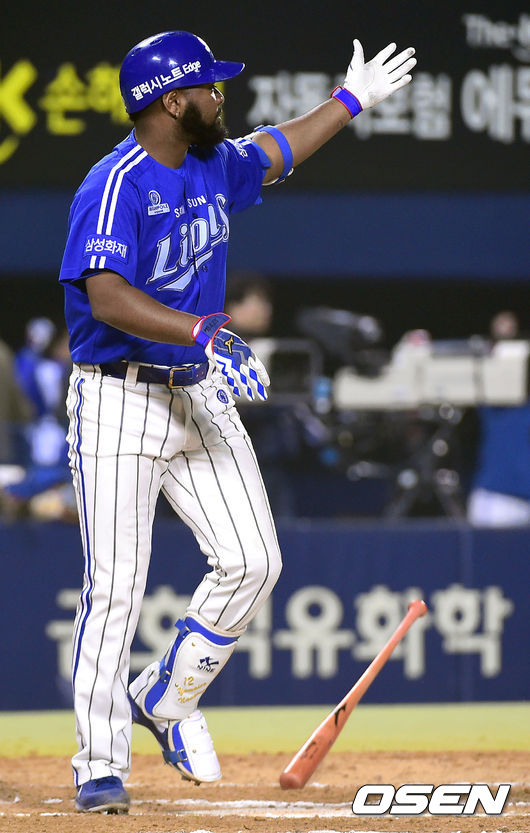 11일 오후 서울 잠실야구장에서 열린 '2014 한국야쿠르트 세븐 프로야구 포스트시즌' 삼성 라이온즈와 넥센 히어로즈의 한국시리즈 6차전,6회초 무사 1,2루 삼성 나바로가 3점 홈런을 날리고 있다.