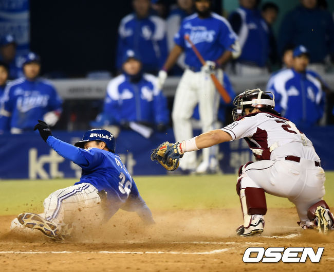 11일 오후 서울 잠실야구장에서 열린 '2014 한국야쿠르트 세븐 프로야구 포스트시즌' 삼성 라이온즈와 넥센 히어로즈의 한국시리즈 6차전, 7회초 삼성 우동균의 중견수 앞 2타점 적시타때 이승엽이 홈으로 몸을 날리고 있다.