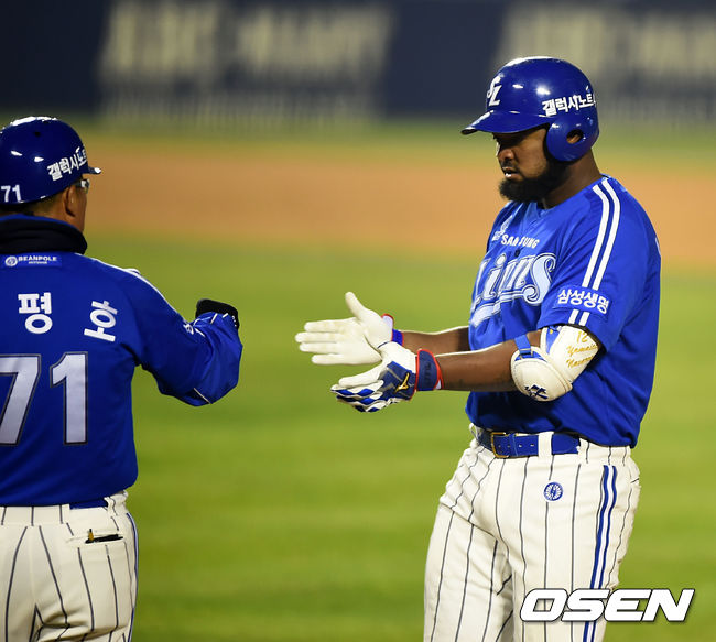 11일 오후 서울 잠실야구장에서 열린 '2014 한국야쿠르트 세븐 프로야구 포스트시즌' 삼성 라이온즈와 넥센 히어로즈의 한국시리즈 6차전, 7회초 1사 주자 1,2루 삼성 나바로가 중견수 왼쪽 1타점 적시타를 날린 후 1루에서 기뻐하고 있다.
