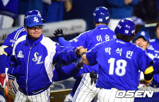 11일 오후 서울 잠실야구장에서 열린 '2014 한국야쿠르트 세븐 프로야구 포스트시즌' 삼성 라이온즈와 넥센 히어로즈의 한국시리즈 6차전 7회초 1사 2,3루 삼성 이승엽과 박석민이 우동균의 2타점 적시타때 득점을 올린 뒤 류중일 감독과 기뻐하고 있다.