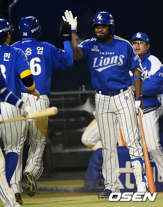 11일 오후 서울 잠실야구장에서 열린 '2014 한국야쿠르트 세븐 프로야구 포스트시즌' 삼성 라이온즈와 넥센 히어로즈의 한국시리즈 6차전, 7회초 삼성 우동균의 중견수 앞 2타점 적시타때 이승엽이 홈으로 몸을 날린 후 덕아웃에서 나바로와 하이파이브를 하고 있다.