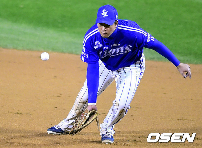 11일 오후 서울 잠실야구장에서 열린 '2014 한국야쿠르트 세븐 프로야구 포스트시즌' 삼성 라이온즈와 넥센 히어로즈의 한국시리즈 6차전 7회말 2사 삼성 채태인이 넥센 김민성의 타구를 놓치고 있다.