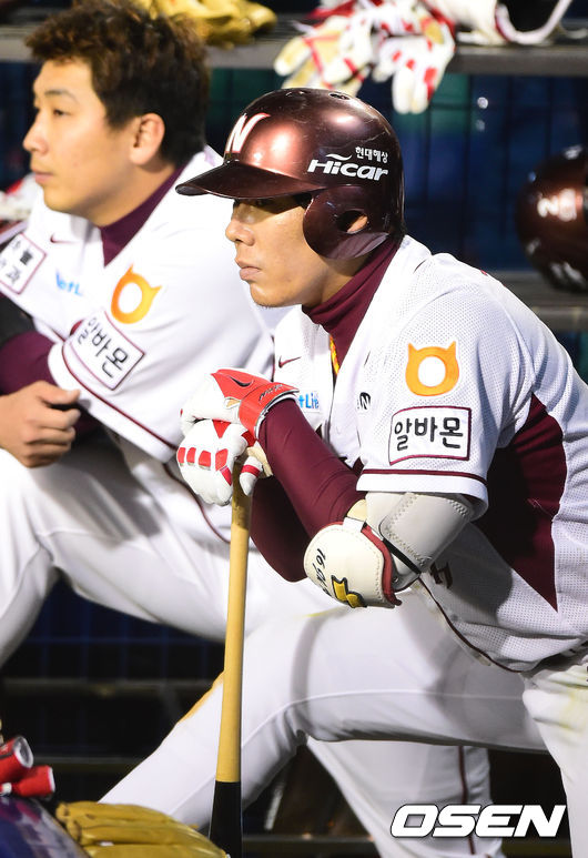 11일 오후 서울 잠실야구장에서 열린 '2014 한국야쿠르트 세븐 프로야구 포스트시즌' 삼성 라이온즈와 넥센 히어로즈의 한국시리즈 6차전 9회말 2사 넥센 박병호 타석때 강정호가 더그아웃에서 자신의 타석을 기다리고 있다.