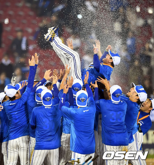 한국시리즈 우승컵은 고비마다 실책을 남발한 넥센 히어로즈를 버리고 삼성 라이온즈의 품에 안기며 통합 4연패라는 대기록을 선물했다.류중일 감독이 행가레를 받고 있다.