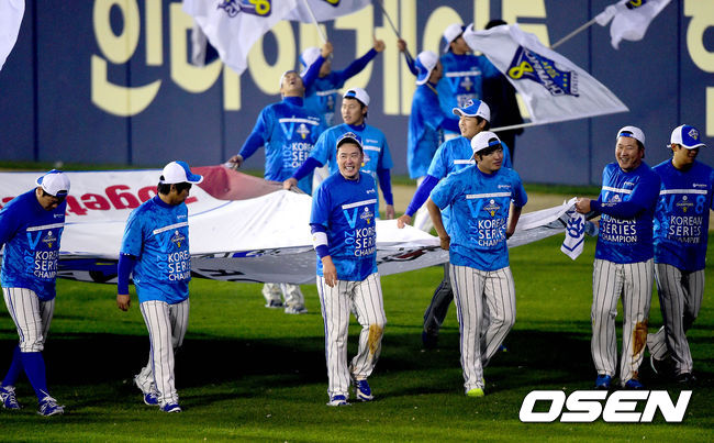 한국시리즈 우승으로 통합 4연패의 대기록을 세운 삼성 진갑용을 비롯한 선수들이 우승 현수막을 들고 외야를 돌며 우승의 기쁨을 만끽하고 있다./dreamer@osen.co.kr