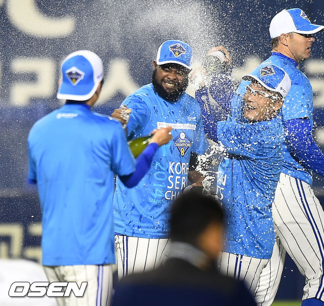 한국시리즈 우승컵은 고비마다 실책을 남발한 넥센 히어로즈를 버리고 삼성 라이온즈의 품에 안기며 통합 4연패라는 대기록을 선물했다. 나바로가 샴페인 세례를 받고 있다.