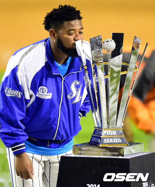 삼성 나바로가 우승 트로피에 세레머니를 하고 있다./jpnews@osen.co.kr