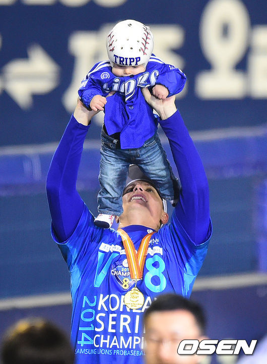 삼성 마틴이 아들과 장난을 치고 있다./jpnews@osen.co.kr