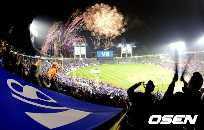 한국시리즈 우승으로 통합 4연패의 대기록을 세운 삼성 선수들이 한국시리즈 우승의 기쁨을 나누고 있는 가운데 불꽃놀이가 펼쳐지고 있다. / baik@osen.co.kr