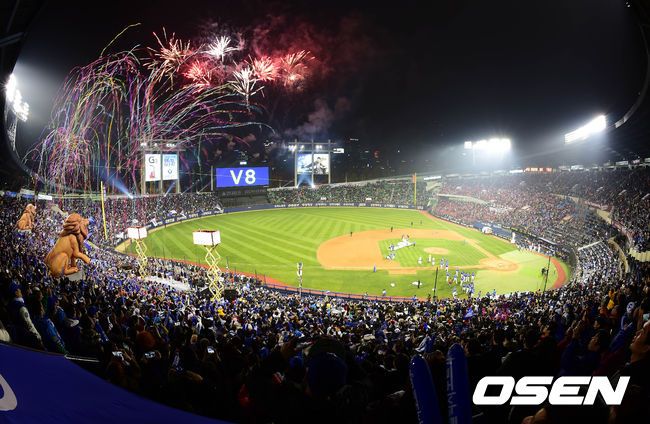 한국시리즈 우승으로 통합 4연패의 대기록을 세운 삼성 선수들이 한국시리즈 우승의 기쁨을 나누고 있는 가운데 불꽃놀이가 펼쳐지고 있다. / baik@osen.co.kr