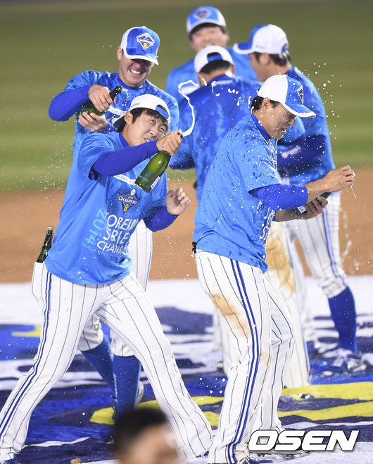 한국시리즈 우승으로 통합 4연패의 대기록을 세운 삼성 선수들이 동료들과 샴페인 세리머니로 기쁨을 나누고 있다./ sunday@osen.co.kr