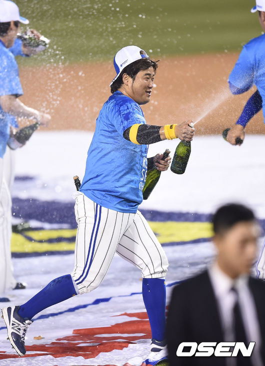 한국시리즈 우승으로 통합 4연패의 대기록을 세운 삼성 선수들이 동료들과 샴페인 세리머니로 기쁨을 나누고 있다./ sunday@osen.co.kr