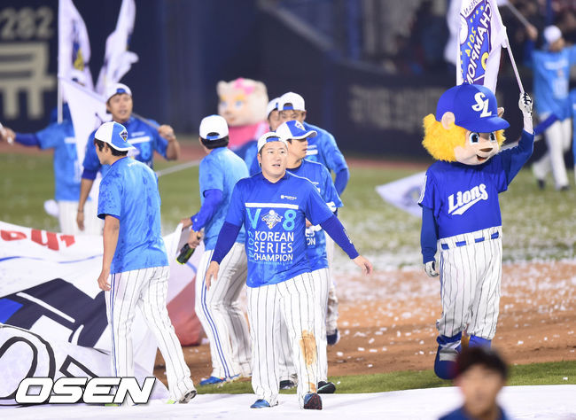 한국시리즈 우승으로 통합 4연패의 대기록을 세운 삼성 선수들이 동료들과 기쁨을 나누고 있다./ sunday@osen.co.kr